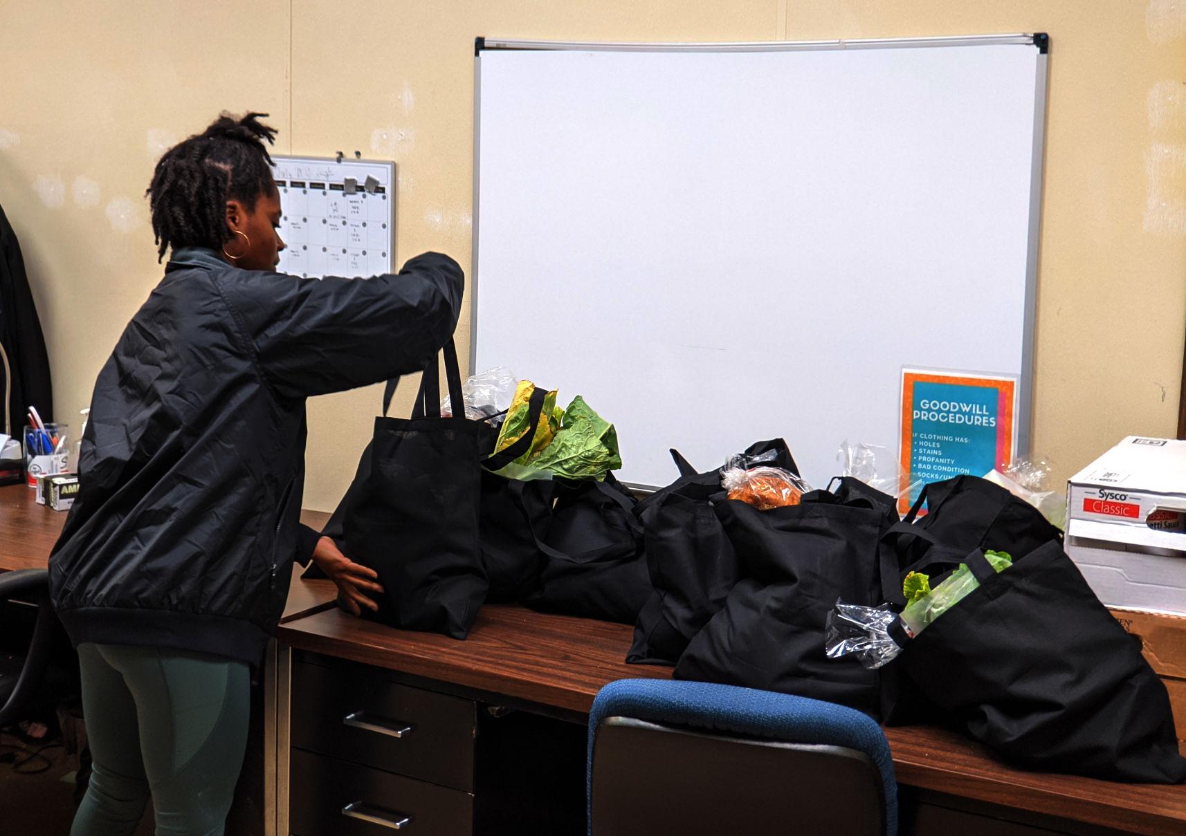 Wintrice Stewart, Knights Pantry distribution specialist and volunteer manager, sets aside an emergency to-go bag for pickup. Jeannie Kiriwas, Stewart’s supervisor, said that this “curbside” model departs from the original “retail” design of the on-campus food bank at Ferrell Commons to encourage better social distancing.